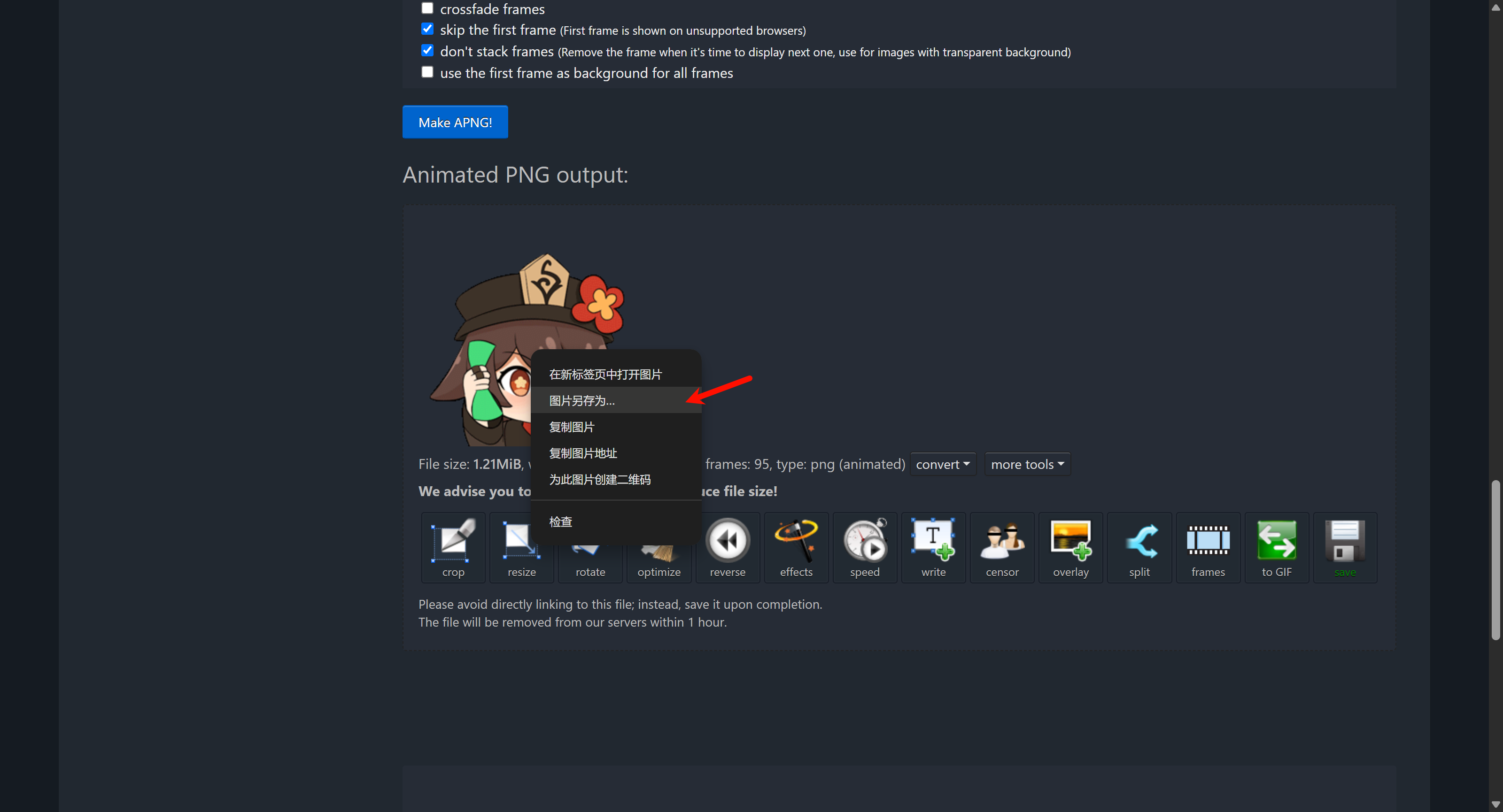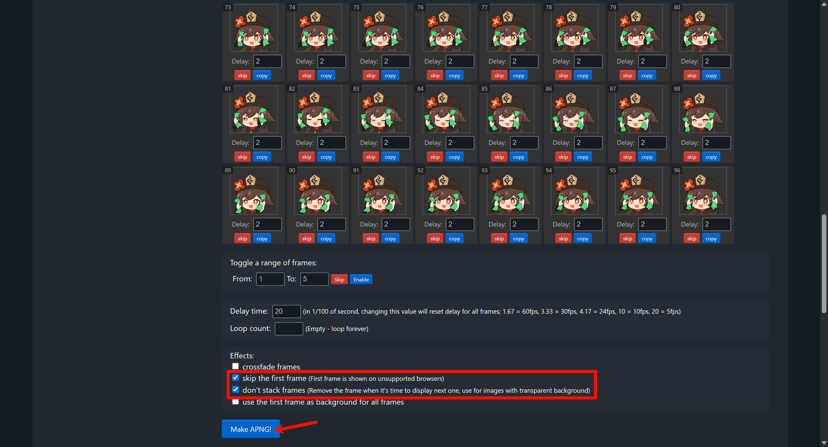 上传成功后,勾选图中标记的两项后点击Make APNG!: